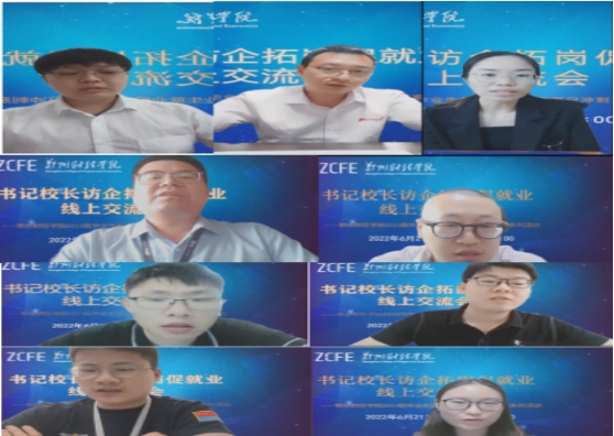 6月21日上午,永利官网携手郑州嵘禾医疗科技有限公司、河南大张实业有限公司、上海力博建设有限公司、河南优步商贸有限公司、拉萨国瑞税务咨询股份有限公司、河南瑞腾塑胶集团有限公司、郑州德邦物流有限公司、华埔建筑装饰工程有限公司、苏州贝瑞斯曼信息科技有限公司9家企业召开书记校长访企拓岗促就业线上交流会。有关校领导,相关二级学院院长、党总支书记及就业指导服务中心工作人员在德正楼第一学术报告厅与企业洽谈交流。会议由就业指导服务中心主任谷峥主持。