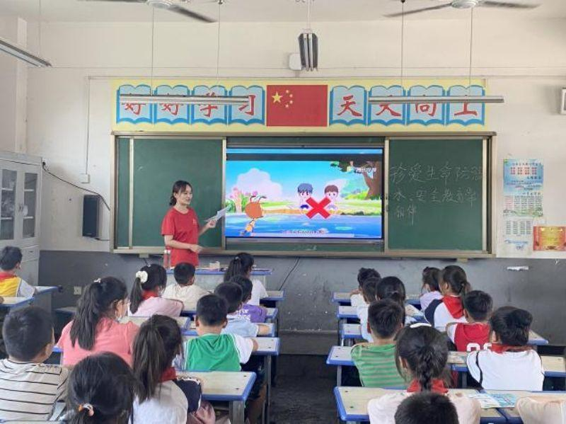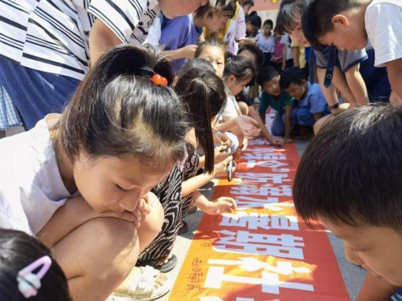 实践团成员在信阳市光山县晏河乡第一完全小学、长垣市张三寨镇官桥营村小学、信阳市光山县杨墩第四完全小学及固始县外国语小学等多所学校开展防溺水宣传活动。实践团成员将防溺水动画视频与生动形象的PPT相结合,以幽默诙谐的语言向小朋友们讲解了防溺水的相关知识;在讲解过程中设置有奖竞答环节,为积极回答问题的小朋友们发放小奖品及专属定制笔,并带领小朋友们在横幅上签署姓名引导小朋友们主动学习防溺水知识。
