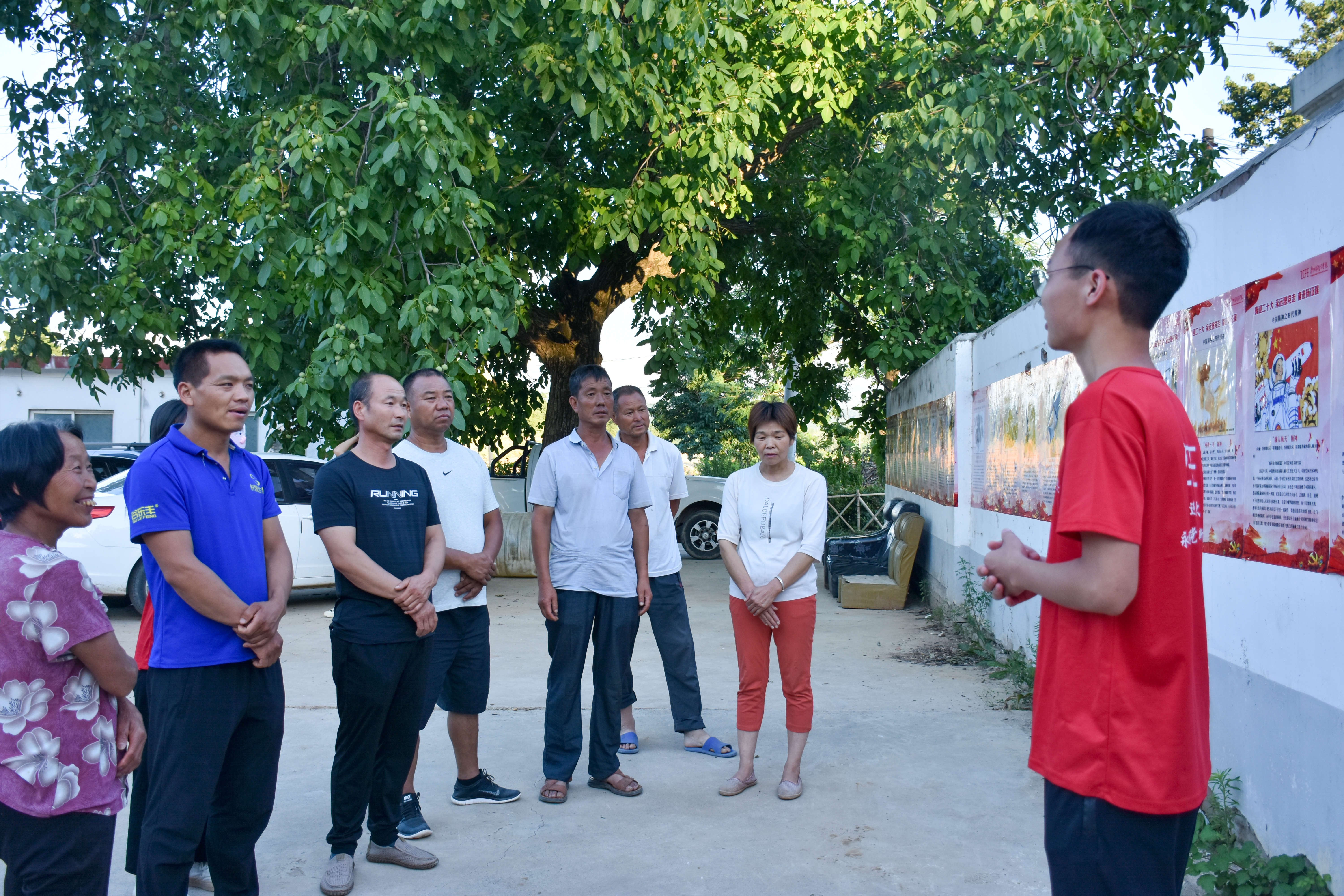启动仪式后,团队成员陆续开展了彩绘文化墙、打造红色文化宣传栏、“中国故事”红色宣讲、入户访谈等活动。宣讲过程中,队员们依据实际情况,在村口、居民家中开展了形式多样的宣讲活动,宣讲成员围绕习近平新时代中国特色社会主义思想的基本精神、基本内容、基本要求向村民作了深入浅出的解读,用通俗易懂的语言、生动的讲解,让群众直观了解习近平新时代中国特色社会主义思想下农村的新发展。在宣讲过程中,队员们加强与群众的互动交流,让宣讲从单向输出模式变为双向互动学习。期间,“乡村筑梦家志愿服务”团队成员毋晓荣、张金菊和贾成旭分别讲述了“人民英雄杨靖宇”、“飞天神女刘洋的成长之路”、“县委书记好榜样焦裕禄”等中国故事,用有深度、接地气的语言讲好中国故事,传播中国精神,使中国精神深入乡村百姓心田。
