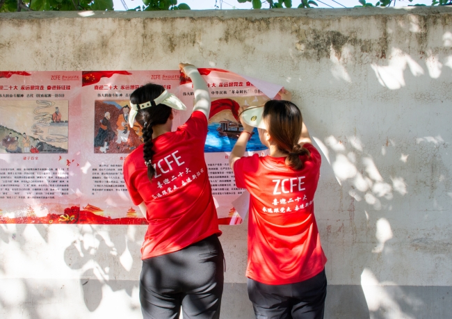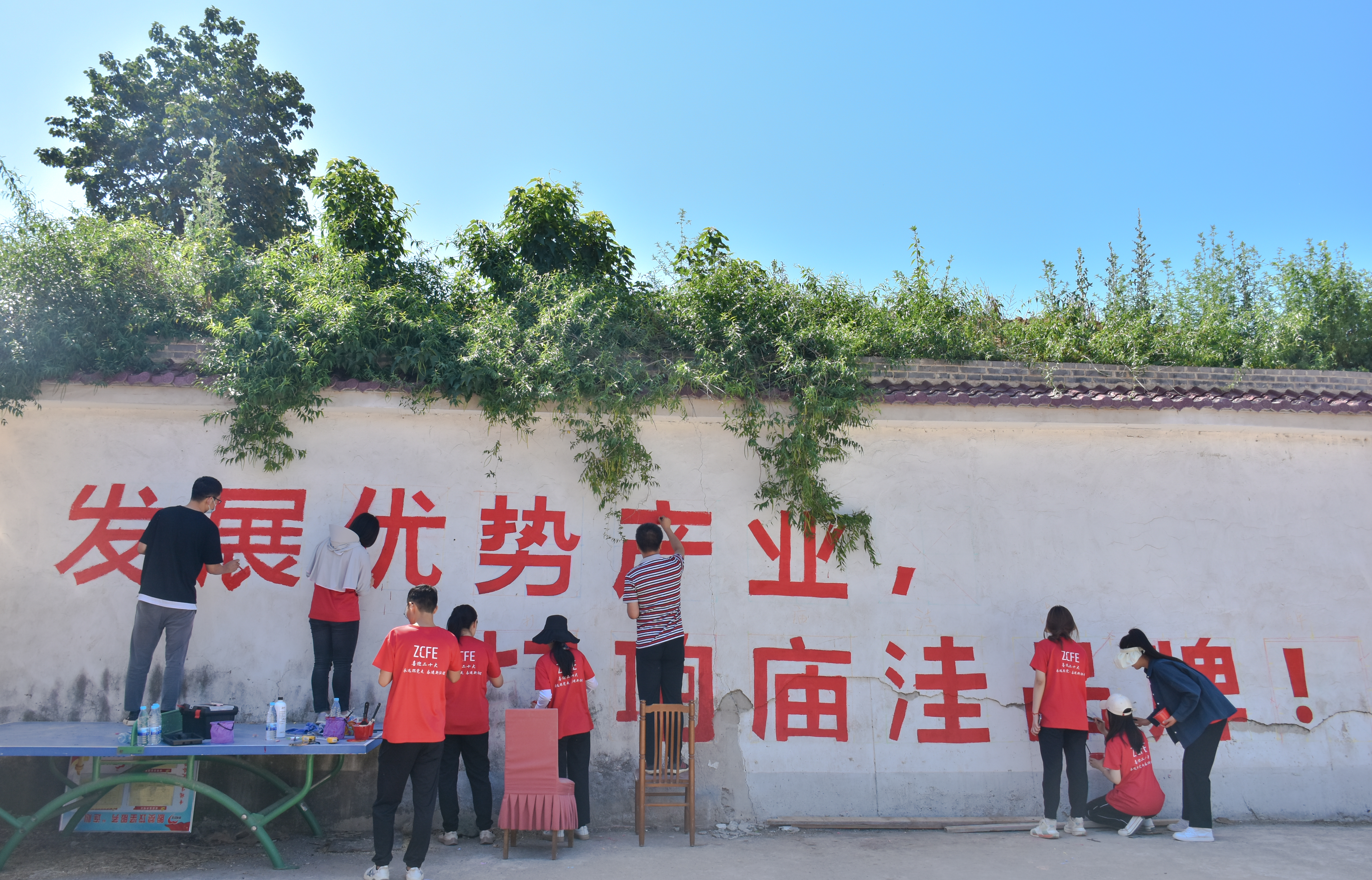 彩绘文化墙环节,团队以“乡村振兴、建设美丽乡村”为出发点和落脚点,旨在通过墙绘来表达、展现出乡村的内在精神风貌。团队成员不畏炎热,在室外环境下认真构图、填色、勾边、完善细节,以墙绘为载体,充分利用方寸间的文化墙,将乡村振兴主题、社会主义核心价值观等内容生动展现出来,墙绘面积达800平方米。